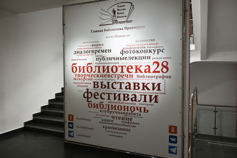 Амурская областная научная библиотека им. Н. Н. Муравьева-Амурского: Благовещенск, ул. Ленина, 139. Часы работы: с 10.00 до 20.00, в субботу и воскресенье с 12.00 до 20.00. Понедельник — выходной.