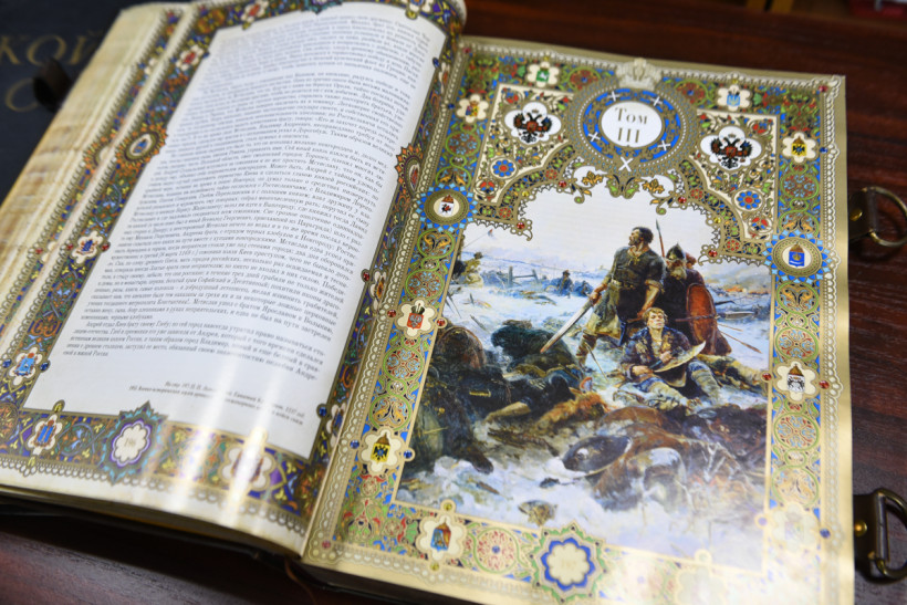 Есть в фонде редких книг и дорогая «обманка» — «История государства Российского» (12+) Карамзина. Потертая кожаная обложка, отделка металлом, замки на книжном блоке и золоченый обрез указывают на старинное издание. А внутри — вполне современный текст. Книга была выпущена в свет в 2012 году и подарена библиотеке Татьяной Телюк, о чем говорит информация на форзаце издания.