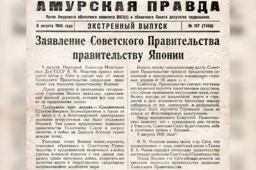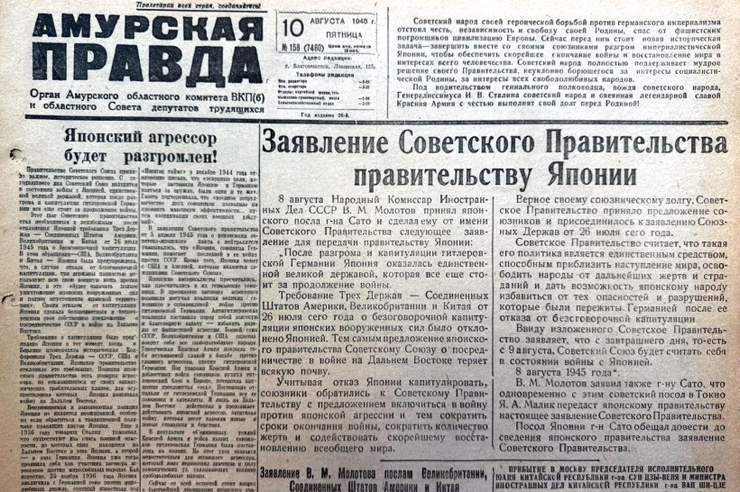 «Под ударами Красной армии и доблестных войск союзников рухнул гитлеровский блок в Европе. Постепенно отпали от Германии все ее союзники. И лишь на Дальнем Востоке продолжает действовать японский агрессор, затягивая войну, которая несет народам новые бедствия и страдания», — пишет «Амурская правда» в экстренном выпуске 9 августа 45-го. И публикует заявление Советского правительства, в котором подчеркивается, что данное решение стало неизбежным после отказа Японии от безоговорочной капитуляции, предложенной США, Великобританией и Китаем 26 июля 1945 года.