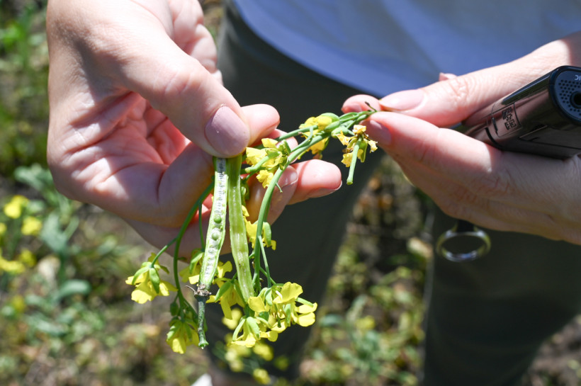 Ярко-желтое поле рапса, до которого мы доехали, так и зовет устроить фотосессию. Даже под пристальным взглядом растение похоже на полевые цветочки. Внимательно изучив стебель, находим небольшие стручки в местах, где отцвел цветок, — в них и прячется будущее зерно. Оно после созревания будет черным, похожим на семена мака. Но пока рапс еще не созрел — уборочная запланирована на сентябрь, как и уборка сои.