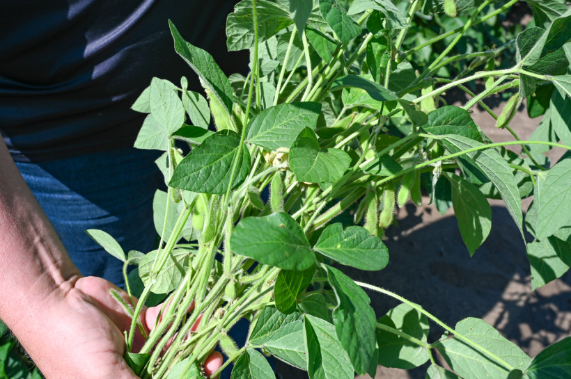 — Это белорусский сорт «рось», очень неплохо себя показывает, — демонстрирует высокие посевы царицы полей агроном. — У нас 80 процентов сортов на полях — отечественной селекции, в том числе нашего ВНИИ сои — это сорта «сентябринка», «топаз», «даурия». В прошлом году засуха была, а в этом — тонем. На некоторых полях, в низине, из-за переувлажнения соя начинает желтеть. Но урожай рассчитываем получить хороший. Видите, в бобике 3-4 зернышка — это хорошо.