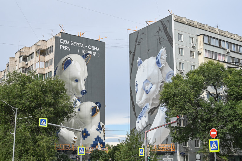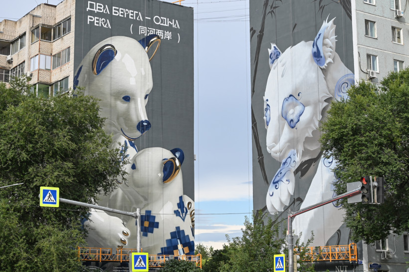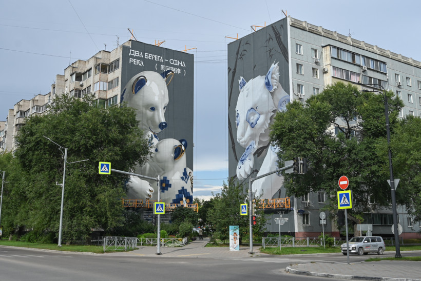 Представьте: вы гуляете по городу и вместо привычного серого фасада видите настоящее произведение искусства высотой в девять этажей! Этим летом две многоэтажки в Благовещенске кардинально преобразились — стали гигантскими холстами в рамках международного арт-проекта «Два берега — одна река». На одном фасаде изображение бурой медведицы с медвежонком. Художник стилизовал его под роспись старинного китайского фарфора в технике цинхуа — синие краски по белому фону. Второй мурал от известного китайского мастера Nut пока находится в работе и обещает стать не менее впечатляющим подарком городу к сентябрю. «Амурская правда» рассказывает, как рождалась эта красота и какой смысл в нее вложили художники.