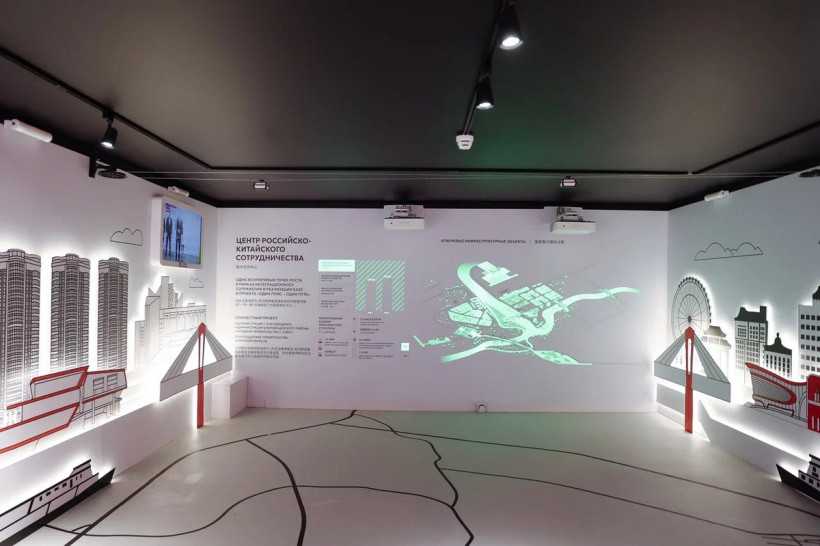 Первый этаж павильона Приамурья посвящен российско-китайскому сотрудничеству. На стенде представлены совместные уже существующие и перспективные проекты. Среди них — «Золотая миля», международный автомобильный мост и трансграничная канатная дорога. Гости павильона могут узнать о ключевых российско-китайских культурных, спортивных и экономических событиях, прошедших за последние десять лет. Также показана работа созданного в рамках поручения президента Центра компетенций.
