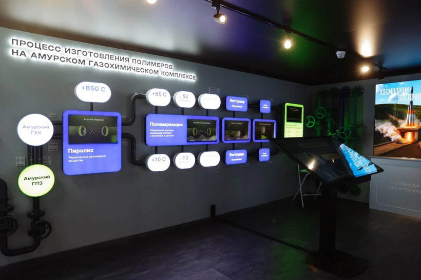 Второй этаж экспозиции выполнен в виде химической лаборатории. Акцент сделан на переработке полимеров и получаемой из них продукции. На стенах разместили информацию о якорных проектах формирующегося в регионе газохимического кластера — Амурского газоперерабатывающего завода и Амурского газохимического комплекса. А третий этаж по многолетней традиции стал местом встречи представителей региона с партнерами и потенциальными инвесторами, зоной переговоров и подписания соглашений.