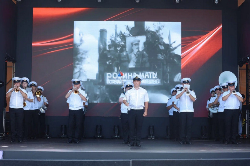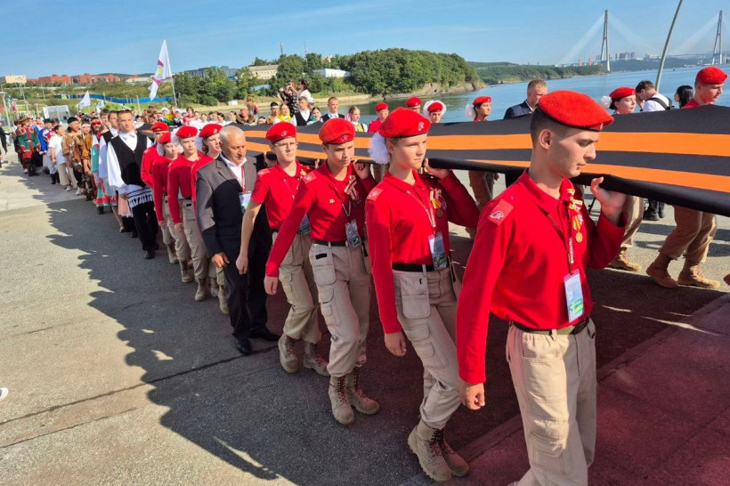 В рамках открытия «Улицы Дальнего Востока» и празднования Дня Победы над милитаристской Японией состоялось торжественное шествие с Георгиевской лентой по набережной ДВФУ до главной сцены выставки. Также под аккомпанемент эстрадного оркестра МГУ имени Г. И. Невельского почетный караул Тихоокеанского высшего военно-морского училища имени С. О. Макарова внес на площадку флаг Российской Федерации и Знамя Победы.