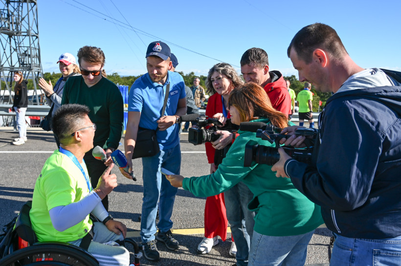 После короткого интервью к бегуну на инвалидной коляске выстроилась очередь из желающих пожать руку.
