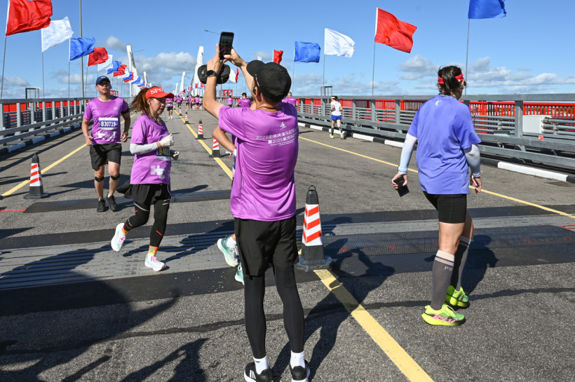 Неожиданно на самом мосту зазвучала легендарная «Катюша»! Это российские спортсмены хором запели в поддержку сотен китайских марафонцев, которые в этот момент бежали по мосту, разворачивались на российской стороне и направлялись на финиш в Поднебесную.