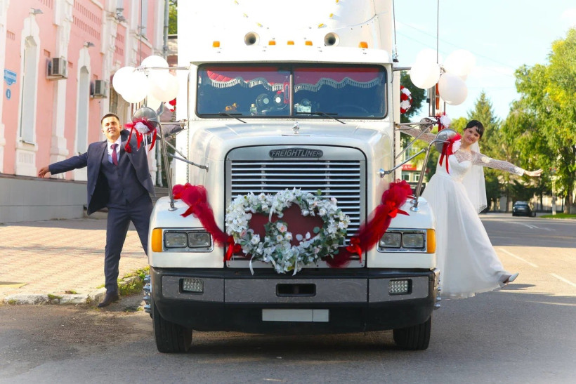 — Идея приехать в загс на необычной машине возникла у меня, — рассказывает глава молодой семьи Денис, попросивший не называть фамилию. — Хотелось чего-то особенного, запоминающегося, а не стандартных фото у легковушки или джипа. Отец мой всю жизнь занимается фурами, работает на них. С детства я был втянут в грузоперевозки, много времени проводил с ним в поездках и мечтал когда-нибудь создать собственную логистическую компанию. В прошлом году мы начали заниматься этой деятельностью, приобрели «френч» (грузовик компании Freightliner. — Прим. авт.). И вот как раз этот автомобиль решили использовать как свадебный.