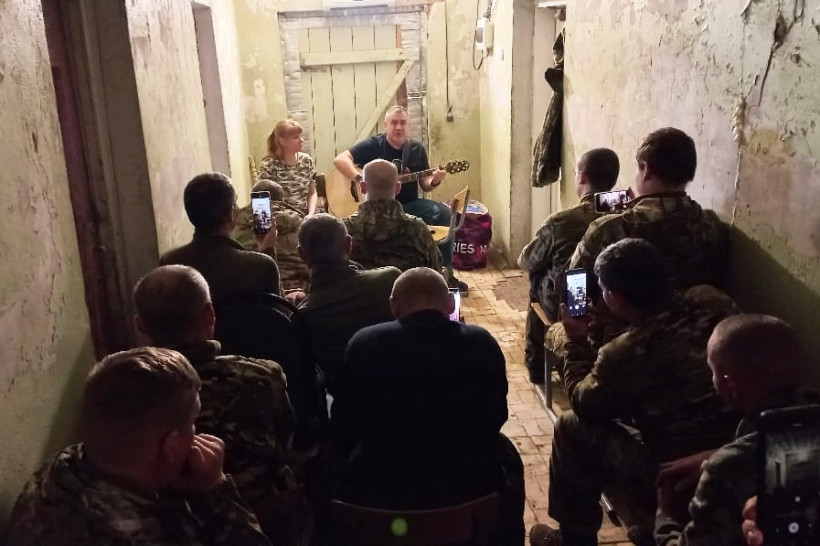 На передовой поэтесса Галина Батурина (на фото у двери слева) — не гость, а свой человек: с начала СВО занимается организацией гуманитарной и медицинской помощи.
