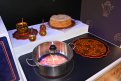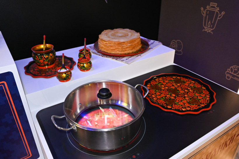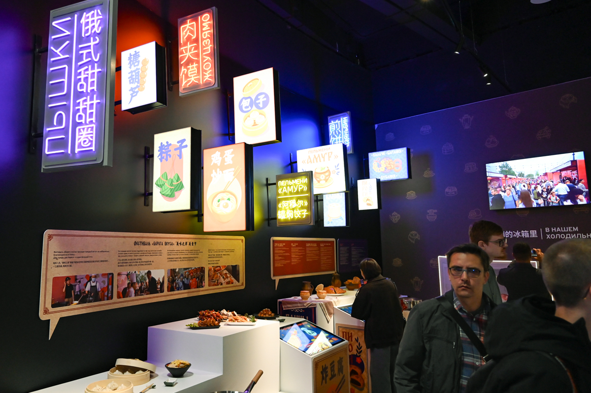 Рядом — два больших прилавка с едой. На «российской стороне» — очень реалистичные муляжи пирожков, пирогов, блинов. И, конечно, пельмени «Амур» в горшочках. А в кастрюле даже «булькает» борщ (дно превратили в монитор). У соседей в глубокой сковороде таким же образом «жарятся» овощи, а рядом на тарелках лежат мясные и овощные шашлычки на шпажках, тофу и баоцзы. Рядом — информация об истории блюд, значения ингредиентов и правила столового этикета.