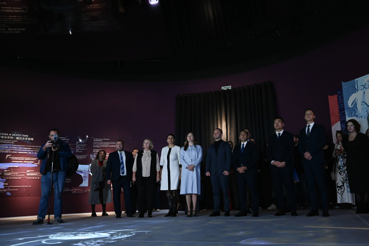 В первом, центральном круглом зале, гостей ждет экран на половину стены. На полу проектор создает волны, из которых «всплывает» феникс, а по экрану путешествуют белый медведь и панда. Это зал «Языки». Ведь именно они формируют культуру народа. За пару минут можно увидеть эволюцию иероглифов и русского алфавита и сравнить, как описывают одни и те же вещи люди двух стран.