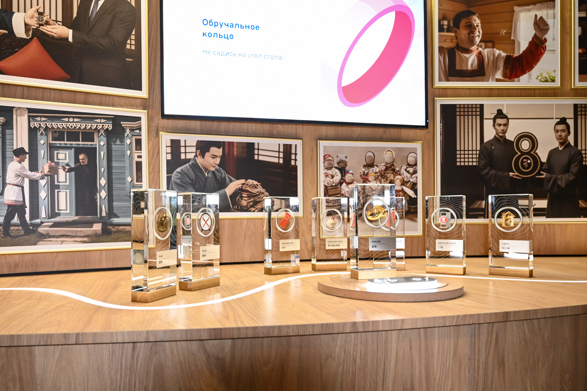 Рядом — экспозиция, которая рассказывает о приметах, привычках и суевериях двух народов. Тоже креативно: нужно взять кристалл с изображением и установить его на платформу. Министр внешних связей и туризма Амурской области Екатерина Киреева выбирает обручальное кольцо, поверья России. На мониторе появляется анимационный ролик. «Не садиться на угол стола, иначе не выйдешь замуж», — сообщают нам.