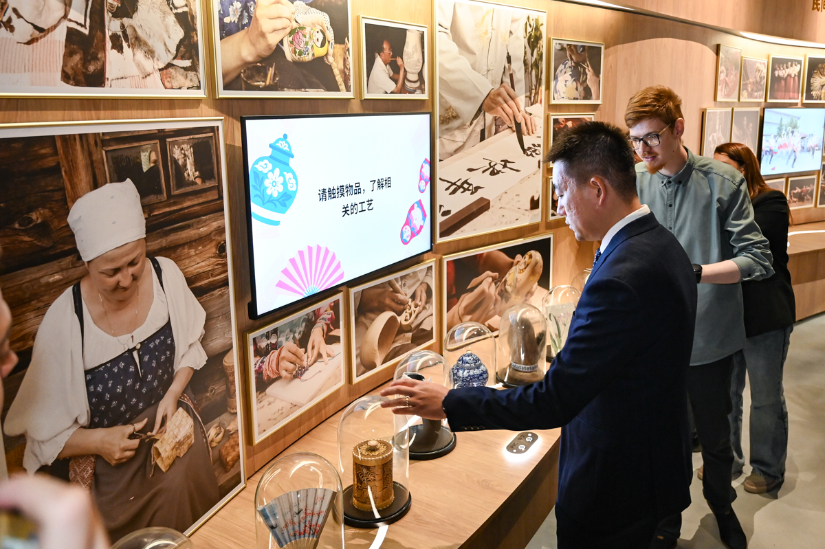 Чуть дальше — традиционные ремесла. Здесь гостям предлагают положить руку на колбу с символом. Выбор представителей делегации падает на берестяную коробочку под стеклянным колпаком. Язык на этот раз выбирают китайский. Включается презентация об истории развития берестяных работ. Представители Поднебесной слушают внимательно и с интересом.