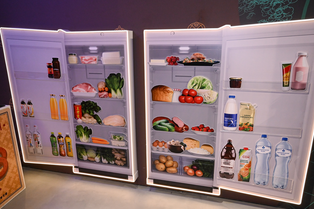 На стене установлены плоские полки холодильников современных россиян и китайцев. В наших — творог и сметана, малина, колбаса и жареная курица. У соседей — овощи, банки с напитками, тоже мясо.