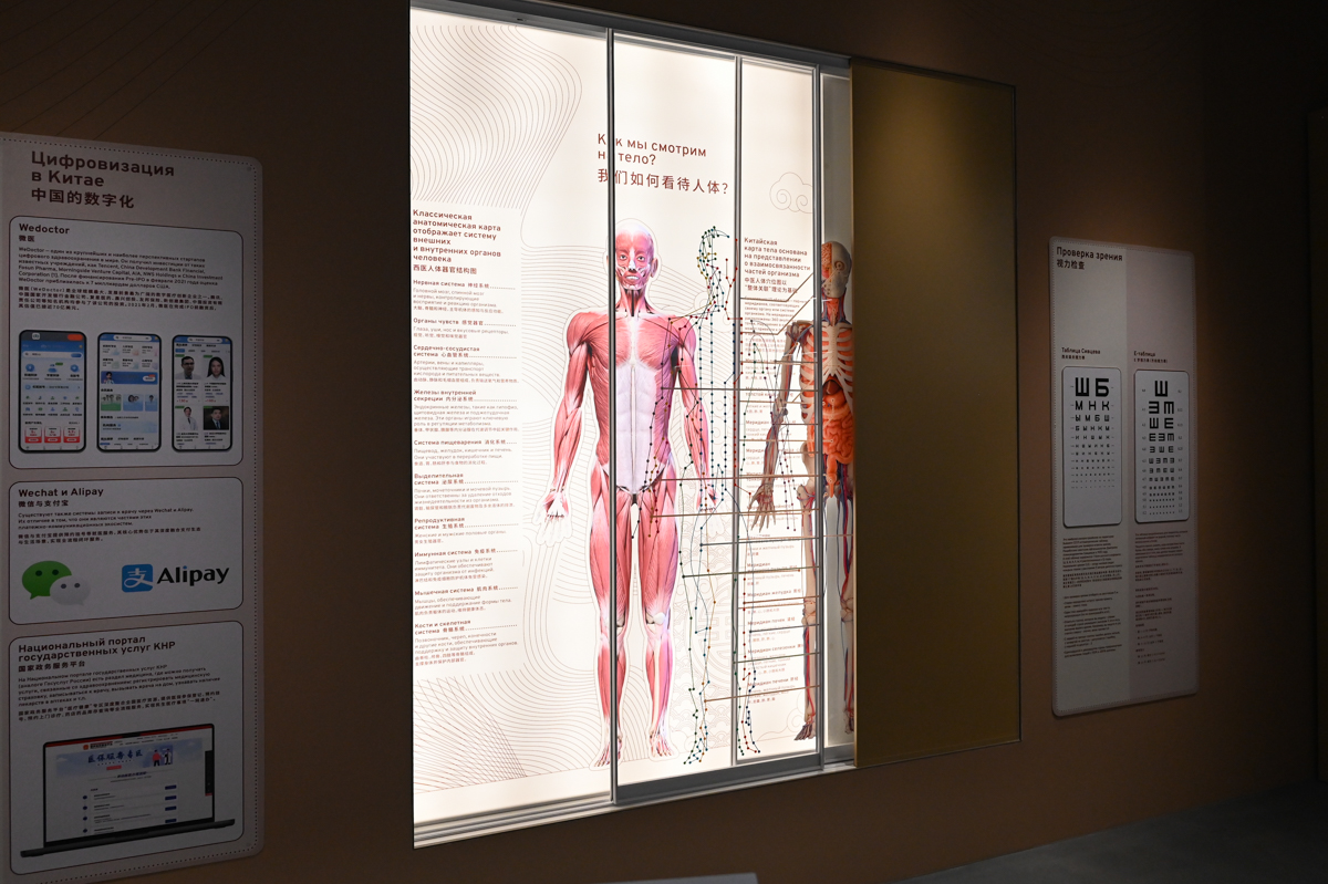 Напротив мы видим изображение тела человека: без кожи, как в медицинском справочнике. Его можно «закрыть» стеклянной прозрачной панелью и увидеть классическую российскую анатомическую карту. А можно сверху наложить еще одну панель и познакомиться со взглядами на здоровье китайской народной медицины.