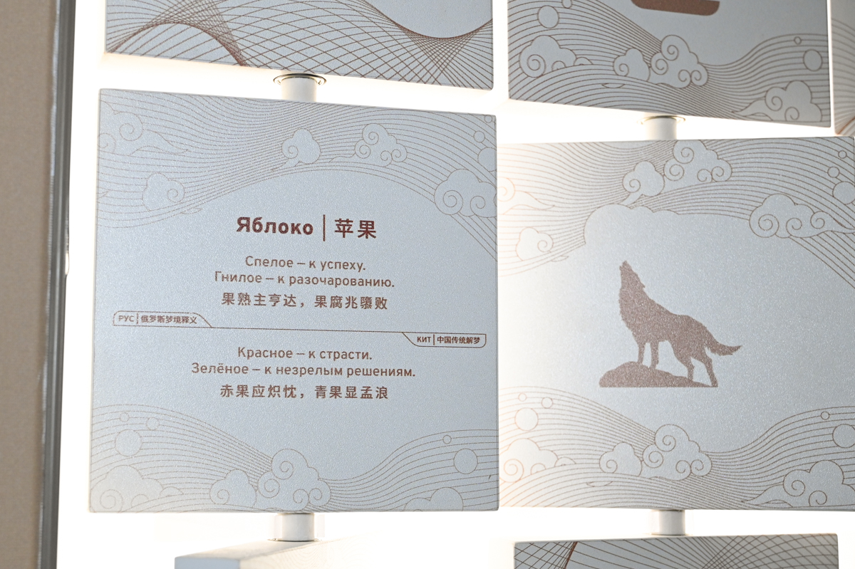 Экспозиция, у которой невозможно не зависнуть — «Сонник». На одной стороне карточек-перевертышей изображены вещи, животные, явления. С другой — их толкования в двух странах. Так, лисица у россиян снится к обману, убегающая — к раскрытию тайн. При этом у китайцев объяснение практически также же. А вот яблоки имеют разные толкования. В нашей стране: «спелое — к успеху, гнилое к разочарованию». В Поднебесной: «красное — к страсти, зеленое — к незрелым поступкам».