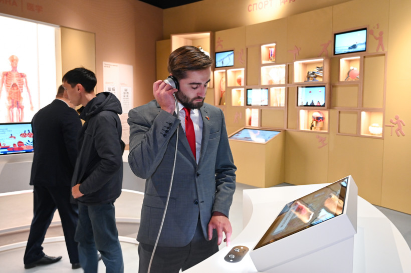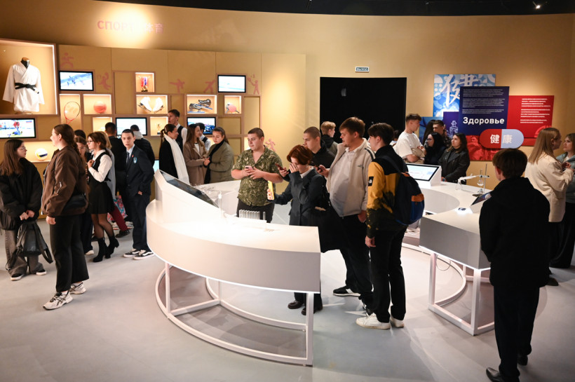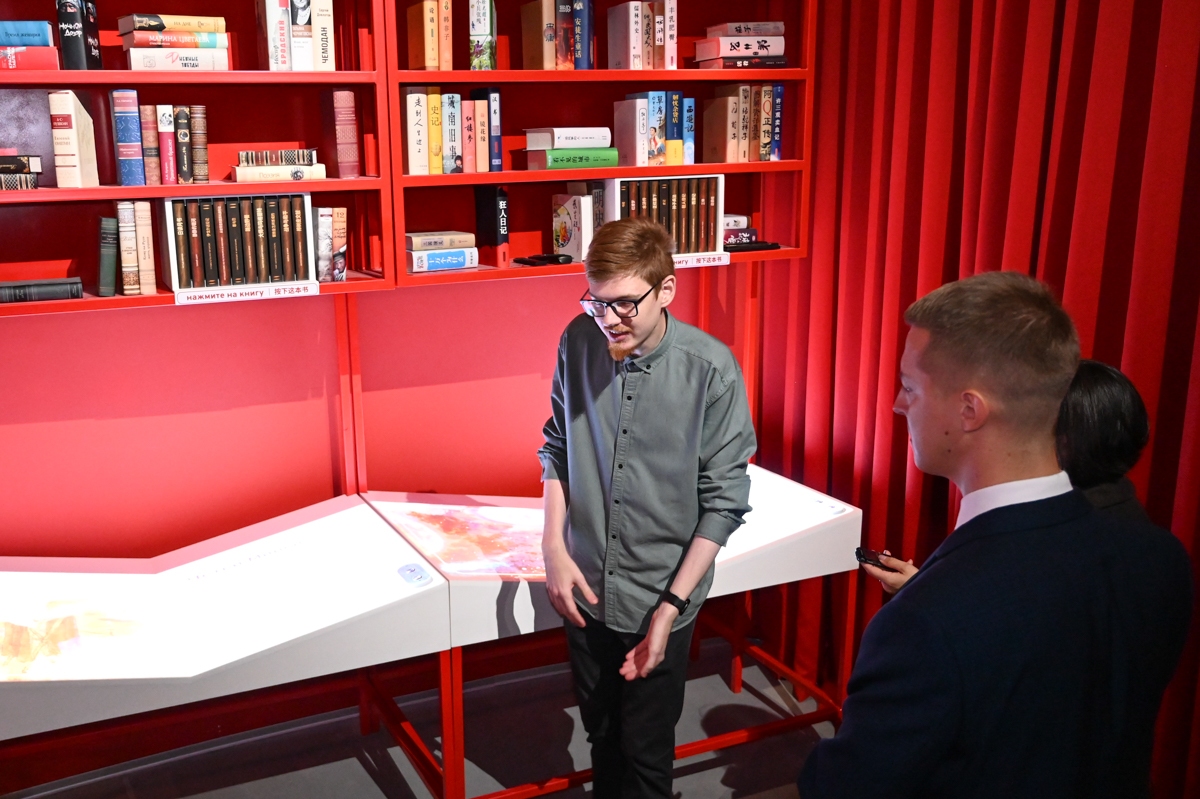 Интерактивный стенд знакомит всех желающих с живописью, ну а тех, кто ценит красоту слова – с литературой. Просто нажмите на корешок российской или китайской книги на полке, и огромные страницы-экраны оживут, рассказывая о произведении.