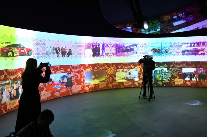 В первом, центральном круглом зале, гостей ждет экран на половину стены. На полу проектор создает волны, из которых «всплывает» феникс, а по экрану путешествуют белый медведь и панда. Это зал «Языки». Ведь именно они формируют культуру народа. За пару минут можно увидеть эволюцию иероглифов и русского алфавита и сравнить, как описывают одни и те же вещи люди двух стран.