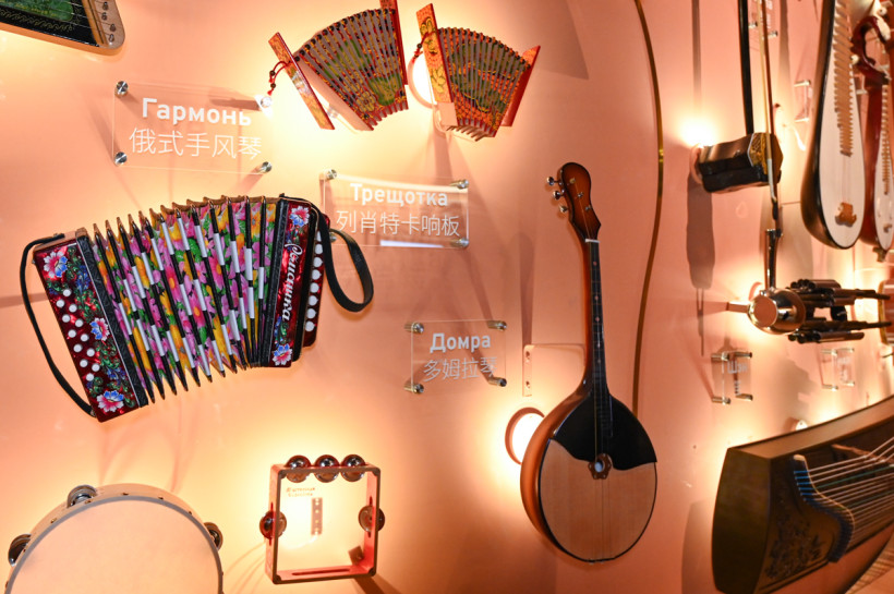 Следующий зал — «Традиционная культура». И начинается экспозиция с музыки. На стене — 12 традиционных инструментов обеих стран, по шесть у каждой. Россия — это балалайка, гусли, домра, Китай — пипа, шэн, люцинь. Посетителям предлагают соединить китайский инструмент с известной русской мелодией или наоборот. Так, Олег Имамеев выбрал шэн (древний китайский язычковый духовой инструмент — прим. авт.) и в зале зазвучала «Калинка-Малинка» в исполнении этого инструмента.