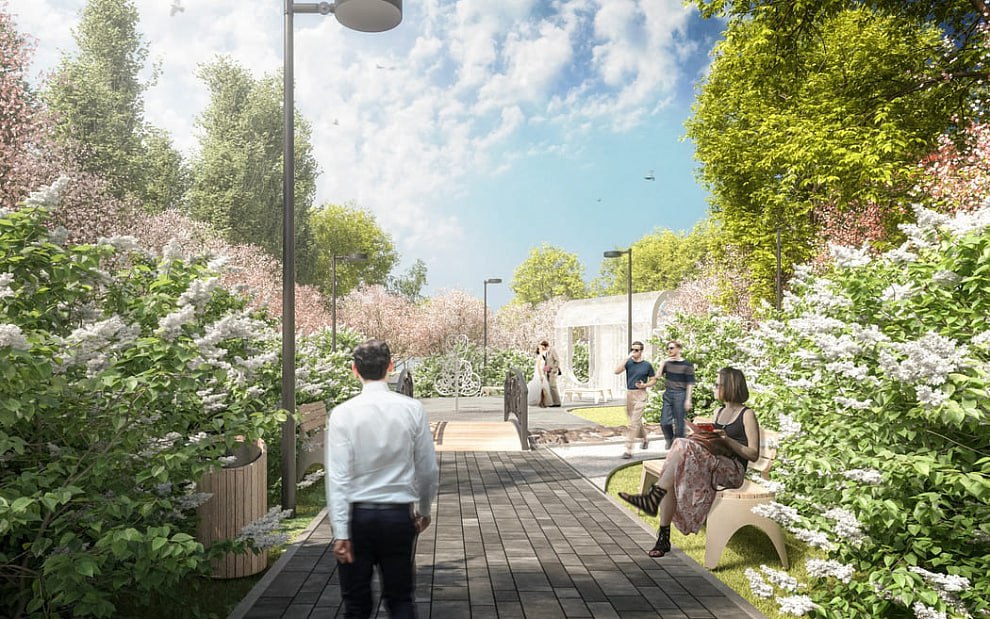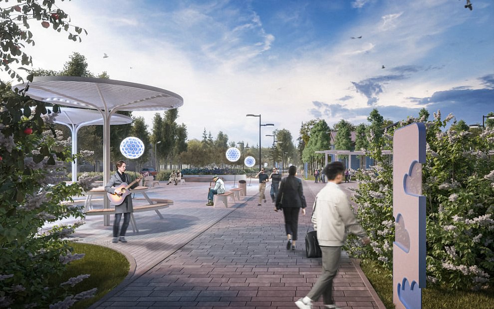 В основу стилистики проекта легли образы облаков и небесной синевы. Форму облаков будут иметь навес сцены, информационные стенды и арт-объекты. В виде самолетов сделают малые архитектурные формы для детей и канатный комплекс. На центральной площади установят металлические скульптуры самолетов и местных птиц.