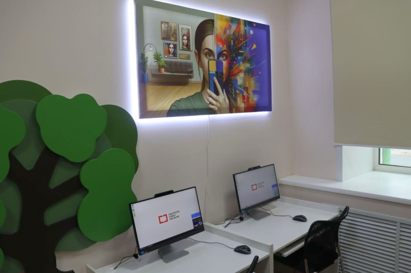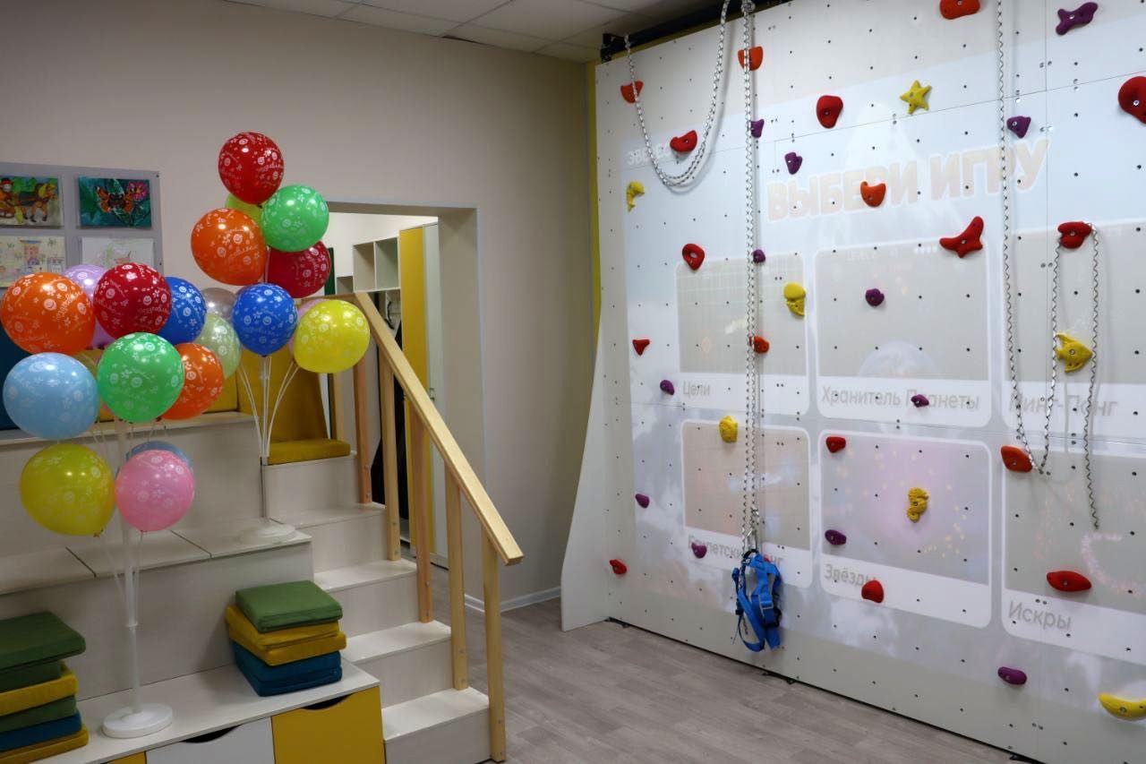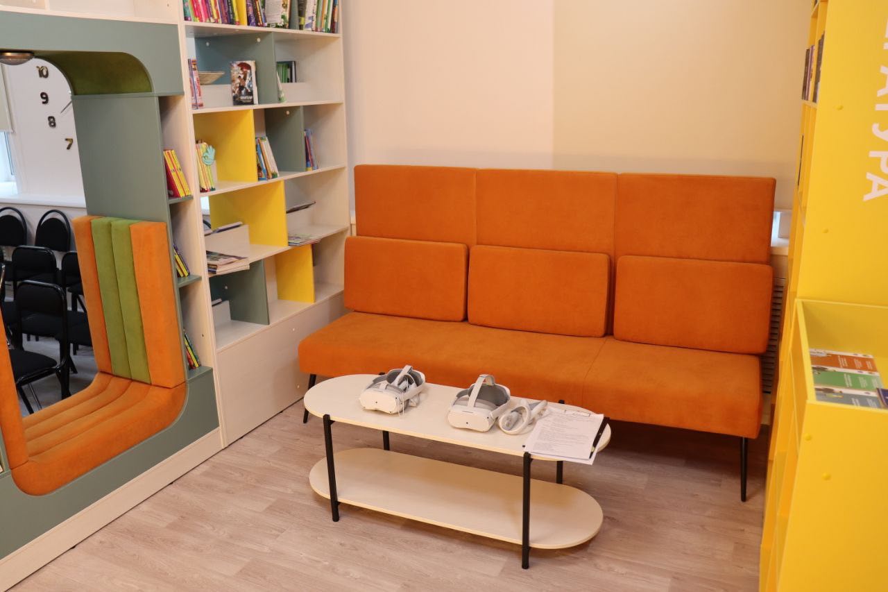 Благодаря дизайн-проекту и новому оборудованию, в библиотеке создали комфортные тематические зоны. Например, там появилась детская зона с низкими стеллажами для книг, стенды-бизиборд и столики для творчества, а также развивающая площадка с адаптивным скалодромом.