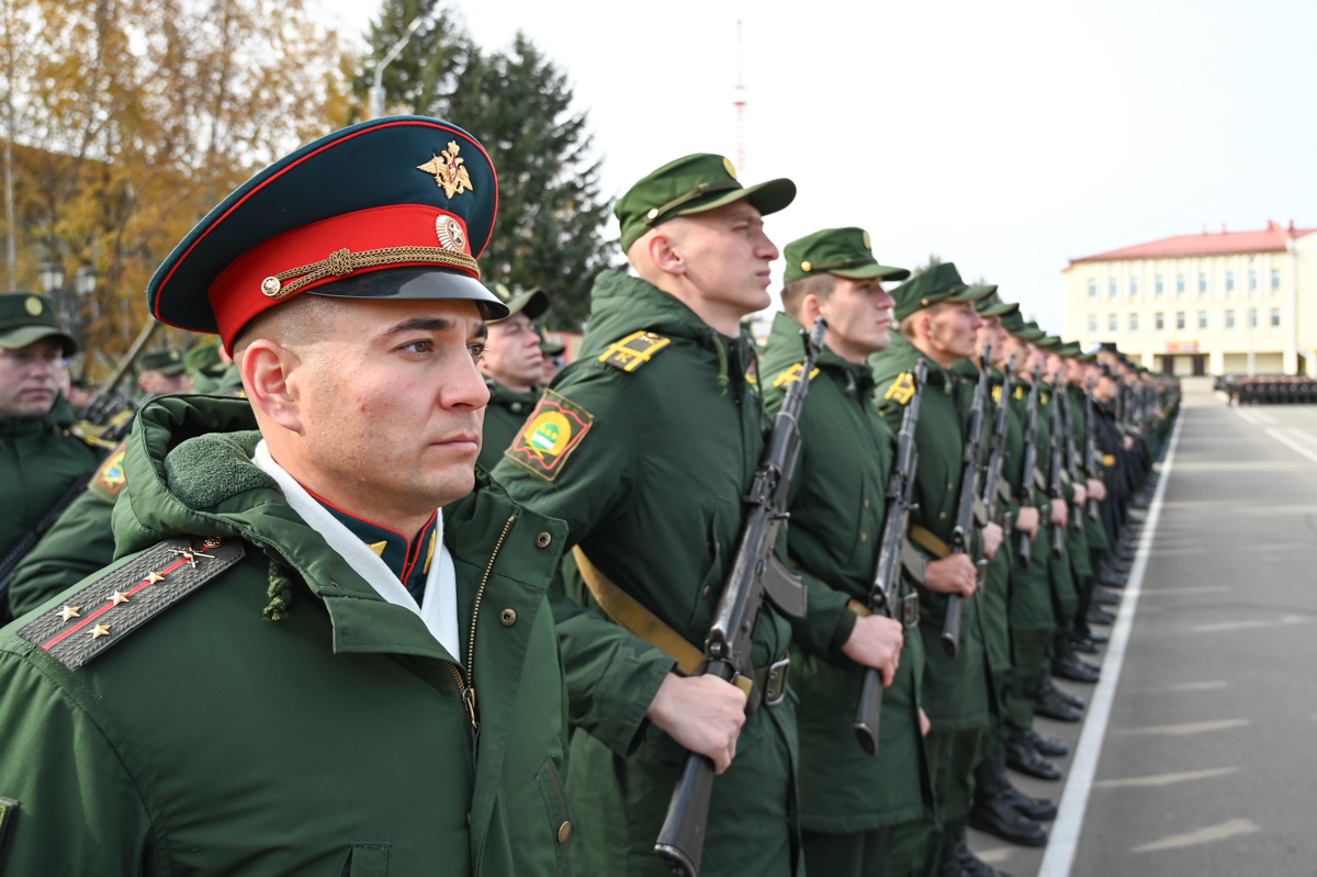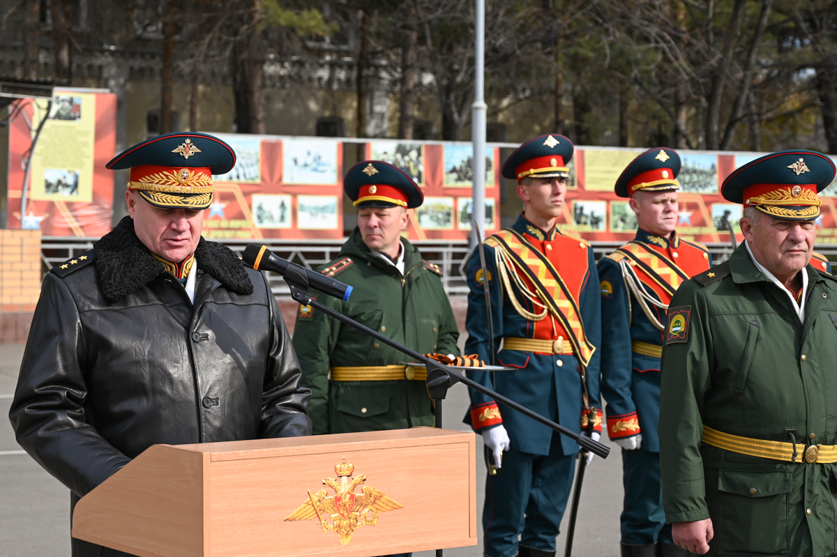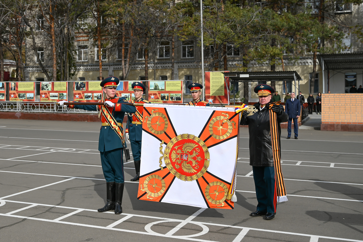 Под звуки военного оркестра на плац вместе с флагом России вынесли боевое знамя прославленного учебного заведения. Почетный караул вытянут, как по струнке. Главком Сухопутными войсками Вооруженных сил России Андрей Мордвичёв прилетел в Благовещенск, чтобы лично выполнить почетную миссию — прикрепить гвардейскую ленту к боевому стягу рокоссовцев.