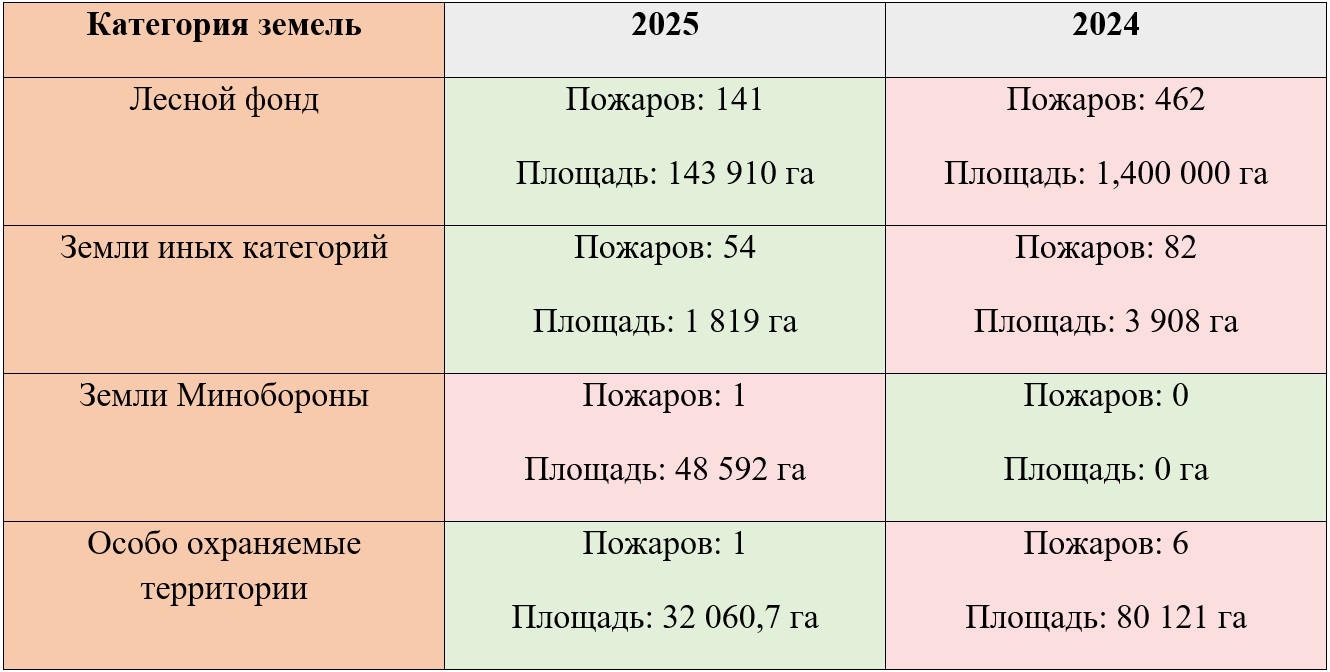 Целевой показатель ежегодного сокращения площади лесных пожаров на 2025 год составляет 308 тысяч гектаров. Он установлен указом Президента РФ. В Приамурье фактическая площадь пожаров в лесах составила 143,9 тысячи гектаров — в 2,1 раза меньше ожидаемого.