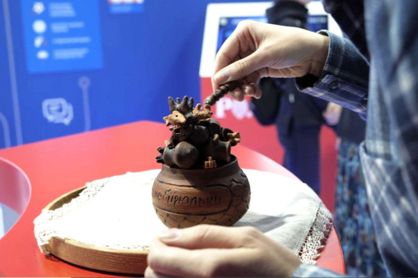 В классическом варианте игры фигурки, которые нужно цеплять специальным крючочком, сделаны из дерева — амурские мастера сделали их из глины. А мы, на стенде Амурской области, изменили и правила – сделали их более динамичными, более азартными. По новым правилам надо было не вытаскивать бирюльки по одной из кучки так, чтобы соседние не пошевелились, а разместить весь набор из кувшинов, тигров, медведей и динозавров на крышке горшка.