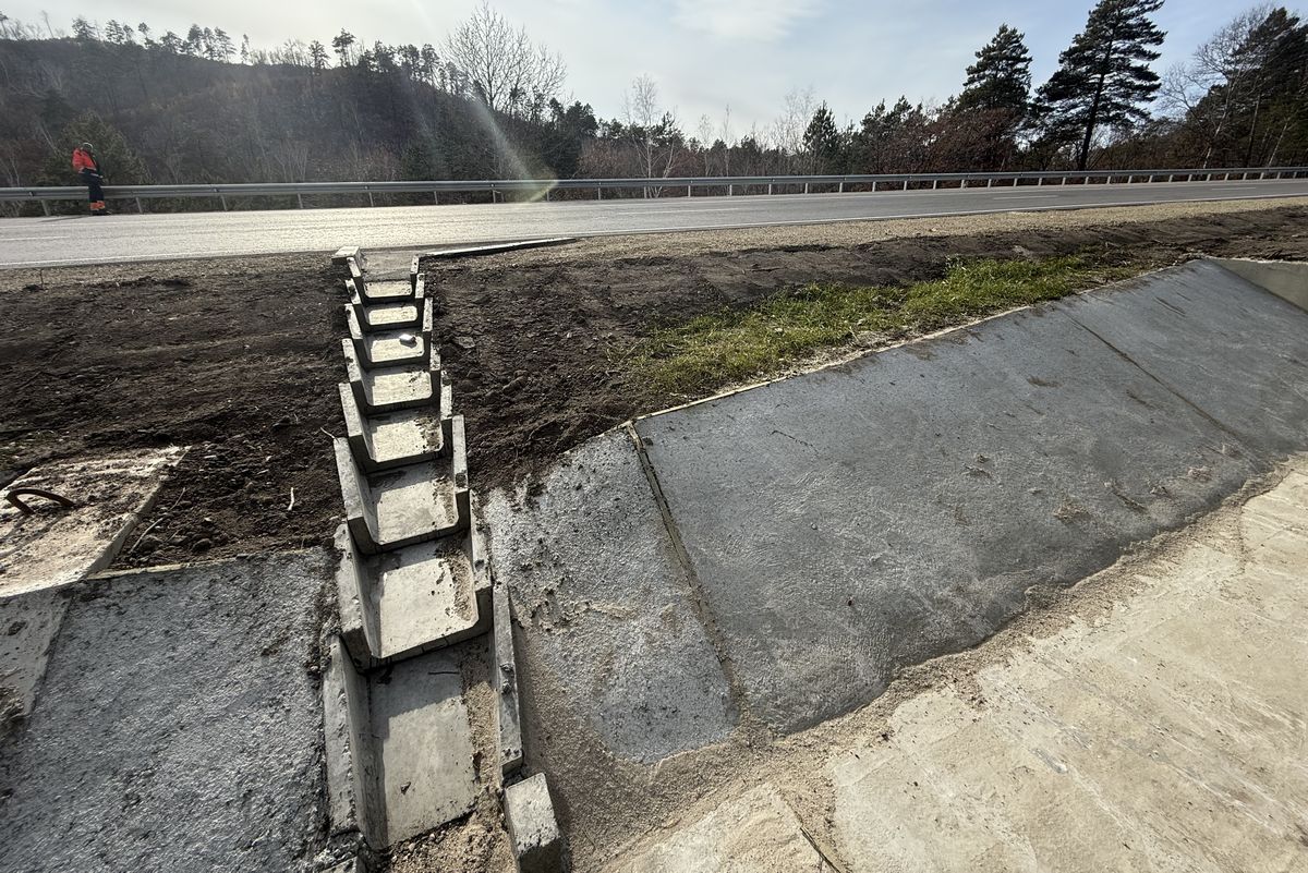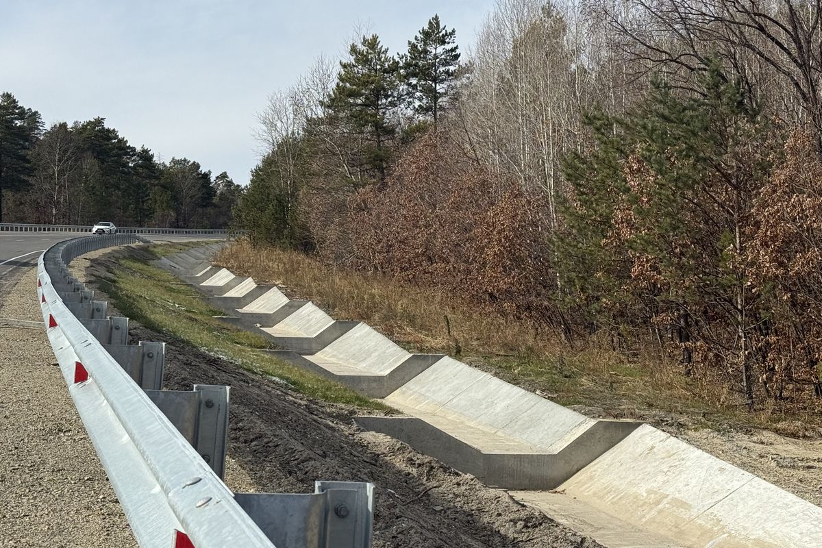 Для отведения воды специалисты установили блоки перепадов и монолитные бетонные лотки кюветов. Перепады в виде ступенек снизят скорость потока воды с проезжей части и склона, чтобы осадки спускались каскадом.
