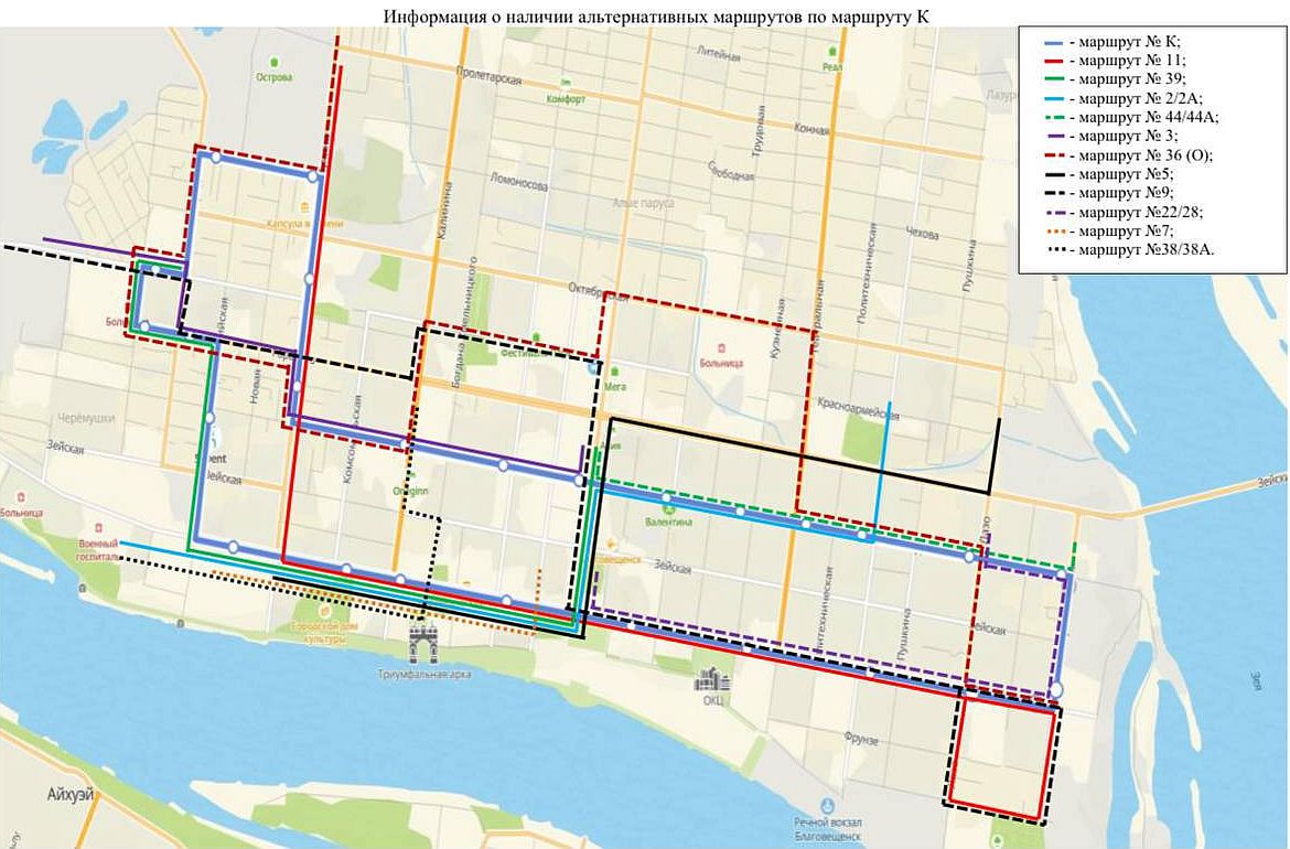 Помимо этого, «К» проходил параллельно с рядом других автобусных маршрутов, которые охватывают те же районы и работают по дублирующим направлениям. Вместо него горожане могут воспользоваться автобусами № 2/2А, 3, 5, 7, 9, 11, 22/28, 36 (О), 38/38А, 39 и 44/44А.