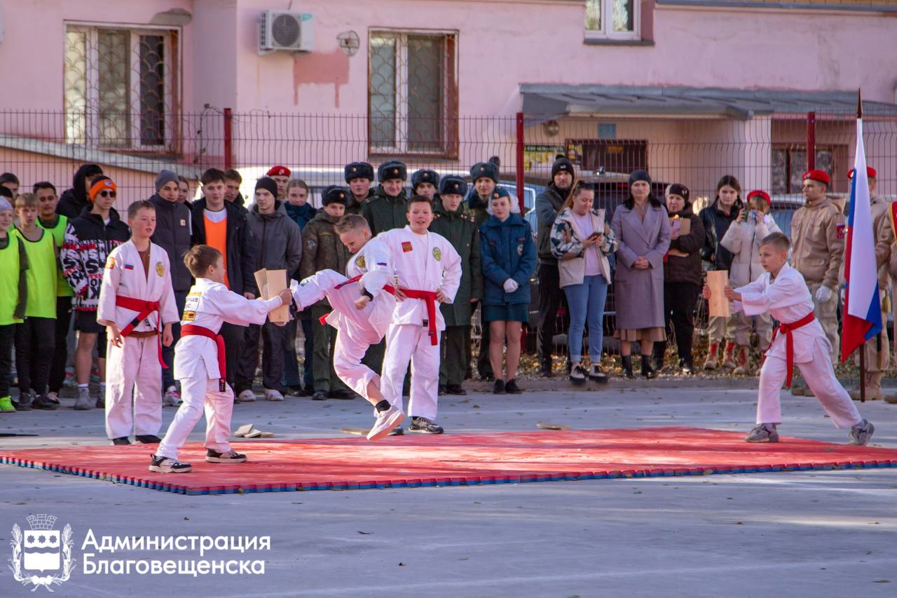 Фото: Администрация БлаговещенскаНа открытии спорткомплекса школьников посвятили в ряды юнармейцев. После этого спортсмены амурской Федерации рукопашного боя провели показательные выступления, а затем площадки торжественно открыли, рассказали 24 октября в мэрии Благовещенска.