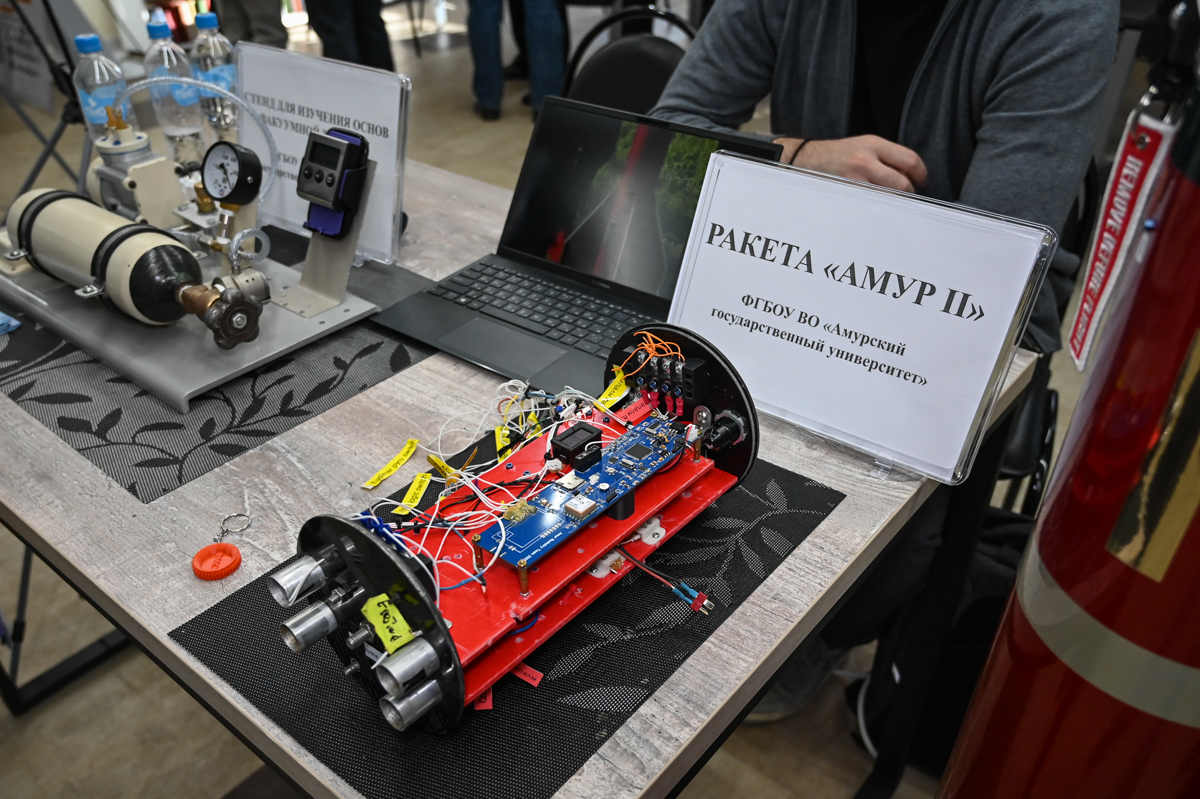 Например, ребята из Амурского госуниверситета представили вне конкурса твёрдотопливную ракету «Амур-2», эта разработка уже «прогремела» на всероссийском и даже международном уровнях. Не только сама ракета, но и электроника в ней – дело рук молодых изобретателей. Они же разработали приложение, которое собирает данные со всех датчиков и отображает состояние ракеты в режиме реального времени.