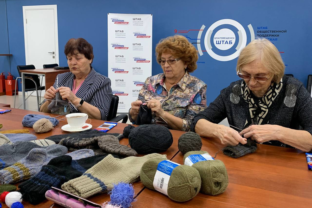 Фото: «Единая Россия»В первый же день со старта акции «Тепло для героя» в амурском штабе общественной поддержки партии собрались пятеро участниц инициативной группы городского «Союза женщин». Производством шерстяных носков для защитников Родины они занялись еще весной 2022 года. С тех пор не только регулярно отправляют посылки на фронт, но и обучают премудростям полезного рукоделия всех желающих, в первую очередь молодежь.