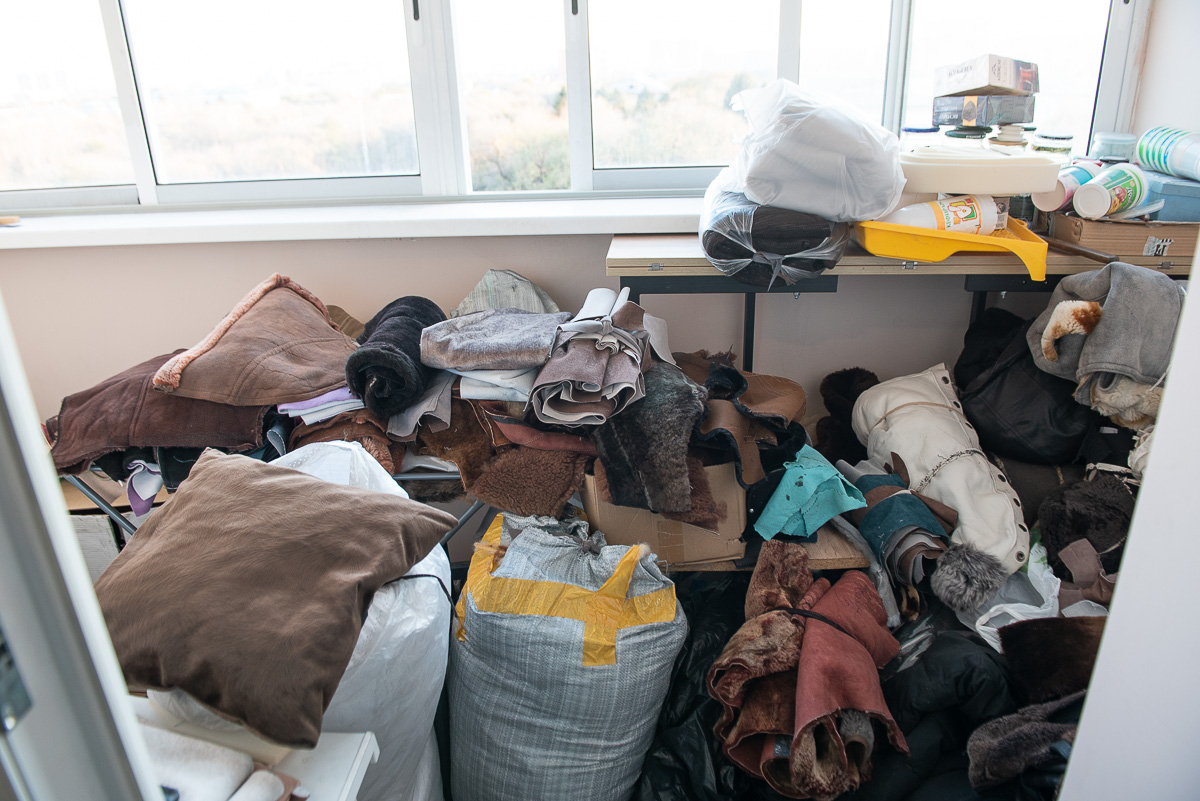 Виктор Евдокимович открыл балкон, где лежали шубы, мешки с обрезками и в стороне — стопка уже готовых изделий.