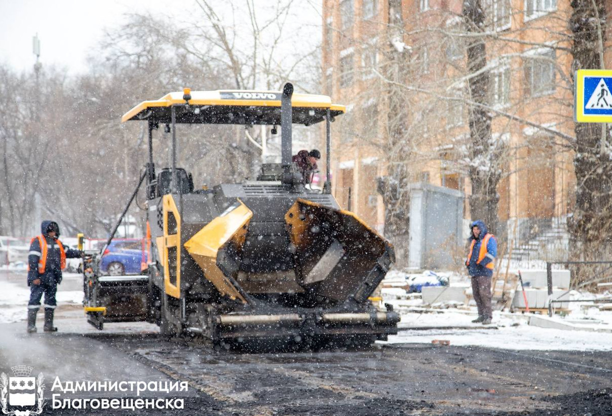 Фото: Пресс-служба администрации г. БлаговещенскаПо контракту дорожный ремонт должен был завершиться в 2026 году, но для удобства жителей решили на зимний период уложить на участке асфальт в один слой. Как только позволит температурный режим, специлисты вернутся в этот район и оборудуют покрытие в два слоя. Также установят бортовые камни, восстановят газоны.