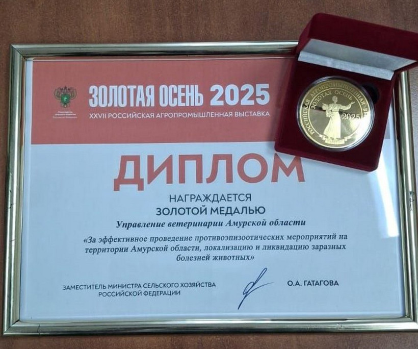 Управление ветеринарии Амурской области признали лучшим в России по проведению противоэпизоотических мероприятий, а также локализации и ликвидации заразных болезней животных. За это накануне на агропромышленной выставке «Золотая осень — 2025» в Москве ведомство наградили золотой медалью профессионального конкурса по внедрению лекарственных средств для ветеринарного применения, лечение болезней животных и популяризации ветеринарной профессии в регионе.