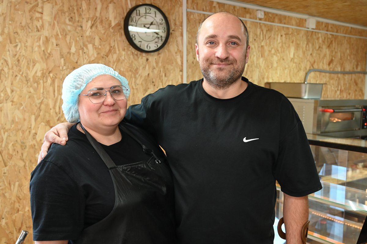 В заведении они работают вдвоем с супругой. Она занимается выпечкой, он — обедами. Ассортимент впечатляет: горячие обеды, салаты, десерты и, конечно, обилие выпечки. Иногда за кассу встает 13-летний сын, он тоже спешит помочь родителям.