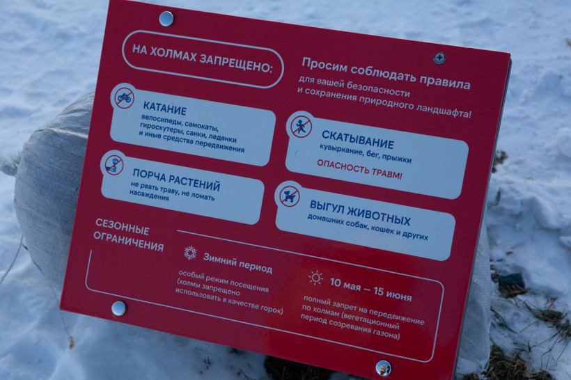 Как объясняют чиновники, снежные склоны холмов не предназначены для катания. Мало того, это просто опасно для здоровья и жизни. Разогнавшийся человек может не успеть затормозить и с высокой скоростью врезаться в скамейки, урны или фонарные столбы, стоящие у подножия. Есть риск столкновения с прохожими, которые просто гуляют по набережной.