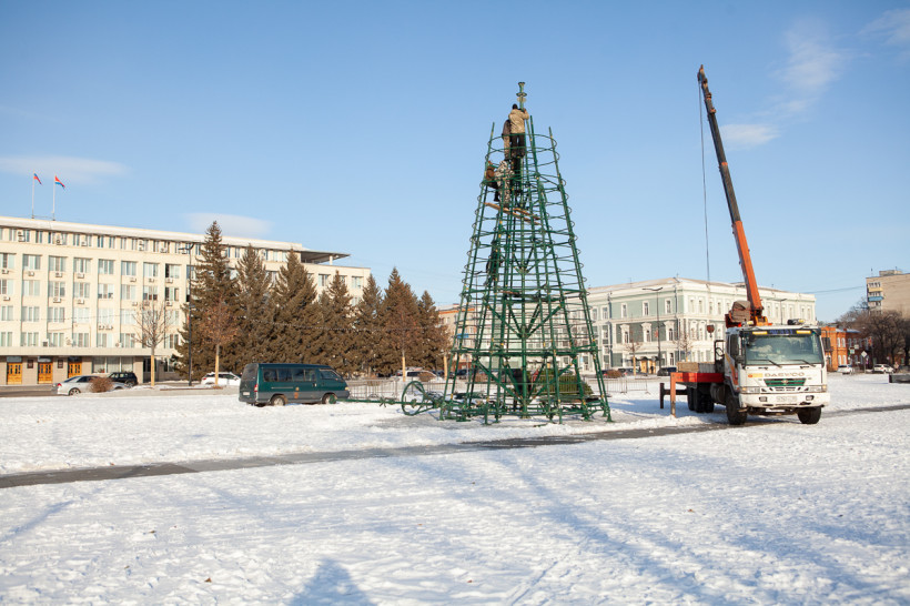 Главную площадь в столице Приамурья вскоре украсит новогодняя ель. Конструкцию начали устанавливать в центре города недалеко от большой тюбинговой горки. Также на площади Ленина зальют каток.