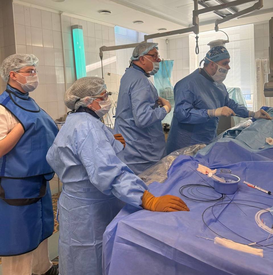 Фото: Амурская медакадемияСпециалистам было необходимо устранить дефект межпредсердной перегородки — врожденный порок сердца. Патологическое отверстие закрывали особым устройством — окклюдером. Оно позволяет избежать открытой операции и обойтись установкой специальной «заглушки» для сердца через вену. Взрослым пациентам при таком вмешательстве не требуется даже общий наркоз.
