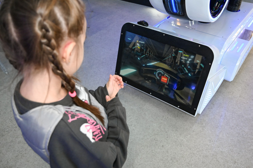 Еще одна симуляция для детей постарше: подросткам предлагают прокатиться на футуристическом мотоцикле по виртуальной трассе с препятствиями. Наблюдать за маршрутом можно на установленном рядом экране.