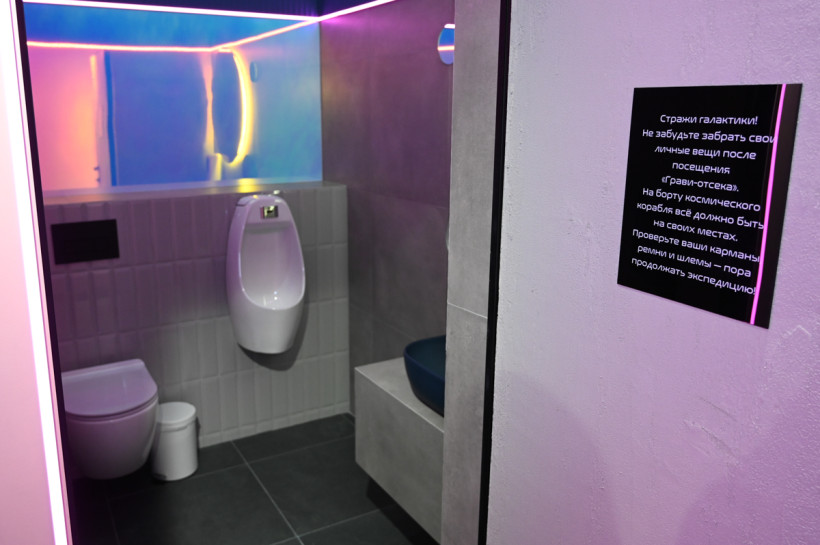 Помогала создать дизайн космопарка амурский дизайнер. Всё пространство организаторы разделили на зоны, каждая из которых носит свое орбитальное название. Тут даже туалетные комнаты выполнены в космическом стиле и обозначены как «Гравитационный отсек».