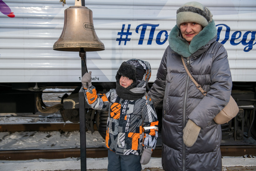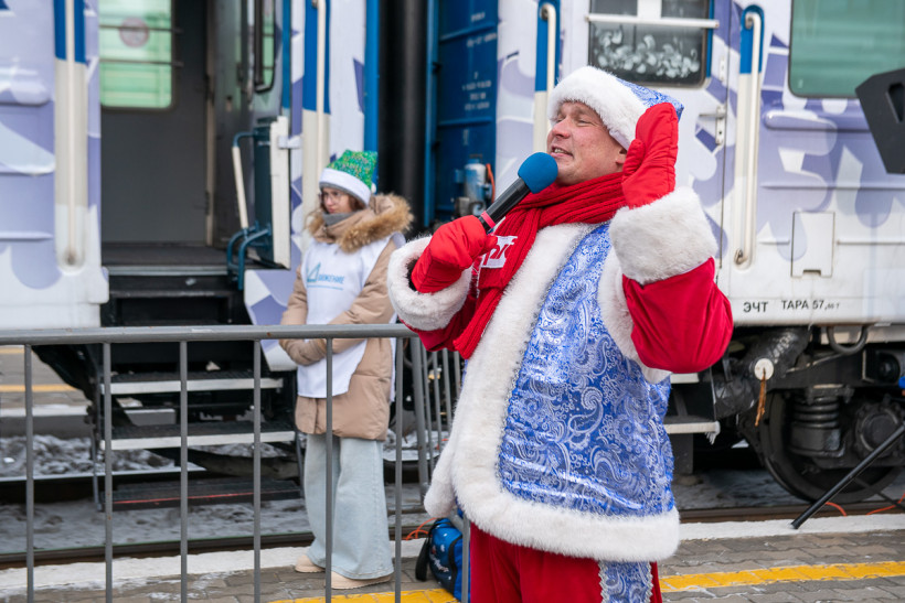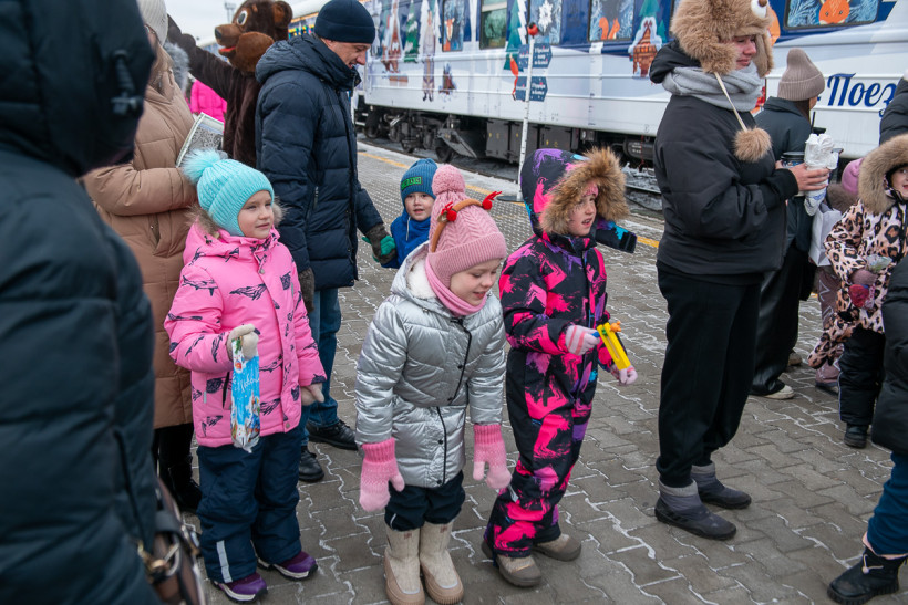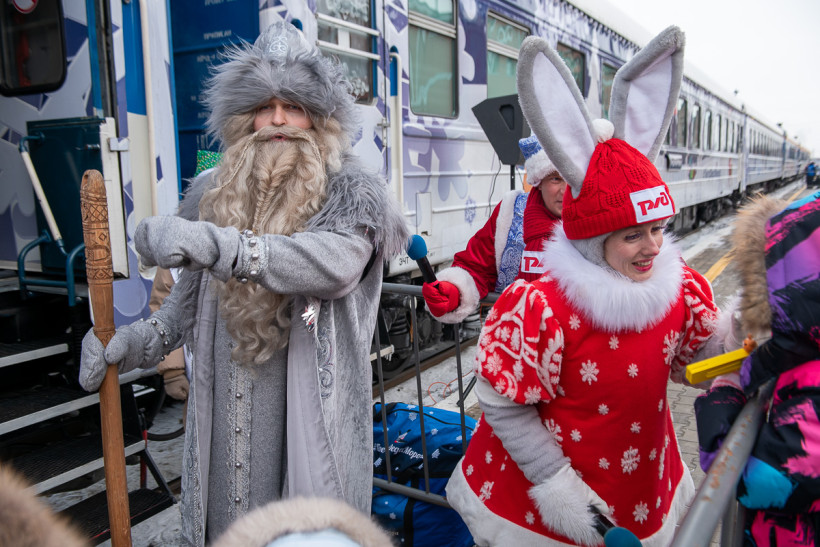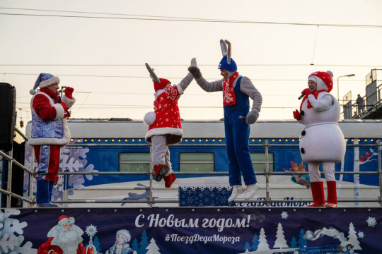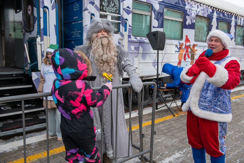 На перроне железнодорожного вокзала — оживленная, хоть и подмерзшая, толпа взрослых и детей в пуховичках и шапках с помпонами. Родители поглядывают на часы. По расписанию поезд с номером 2025–2026 должен прибыть в 11:00, но желанного состава всё нет. Так неудачно начался визит пятого, юбилейного тура Деда Мороза в амурскую столицу.