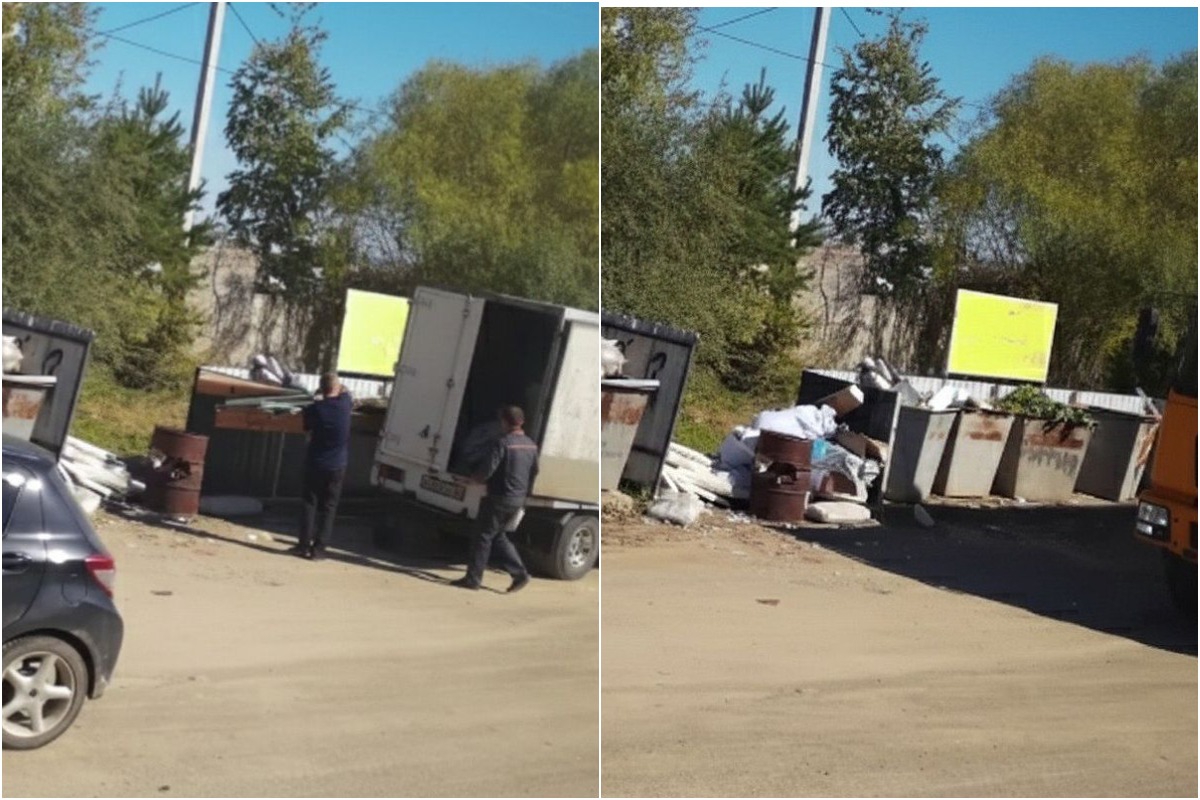 Фото: Минприроды Амурской областиСброс строительных отходов в мусорные контейнеры на улице Кедровой зафиксировали на камеру в сентябре 2025 году. На фотографиях мужчины доставали мусор из грузовика Mitsubishi Canter и сбрасывали его в баки. Нарушители проигнорировали информационный баннер, что площадка предназначена только для твердых бытовых отходов.