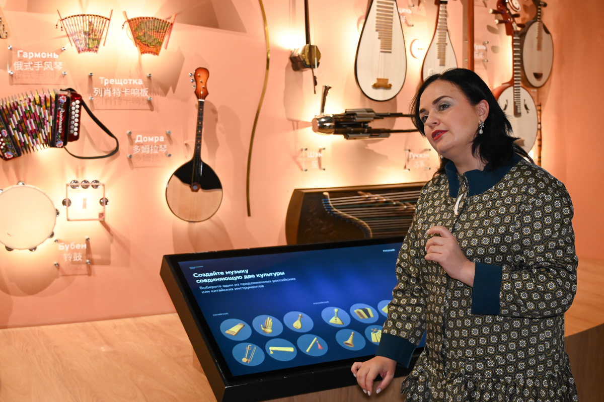В зале «Традиционной культуры» Юрия Трутнева заинтересовала в первую очередь композиция «Инструменты». Надежда Пархунова показала возможности интерактивного стенда — здесь можно выбрать русский национальный инструмент и услышать, как он будет играть национальные китайские песни. Либо наоборот — китайские инструменты и, например, калинка-малинка.