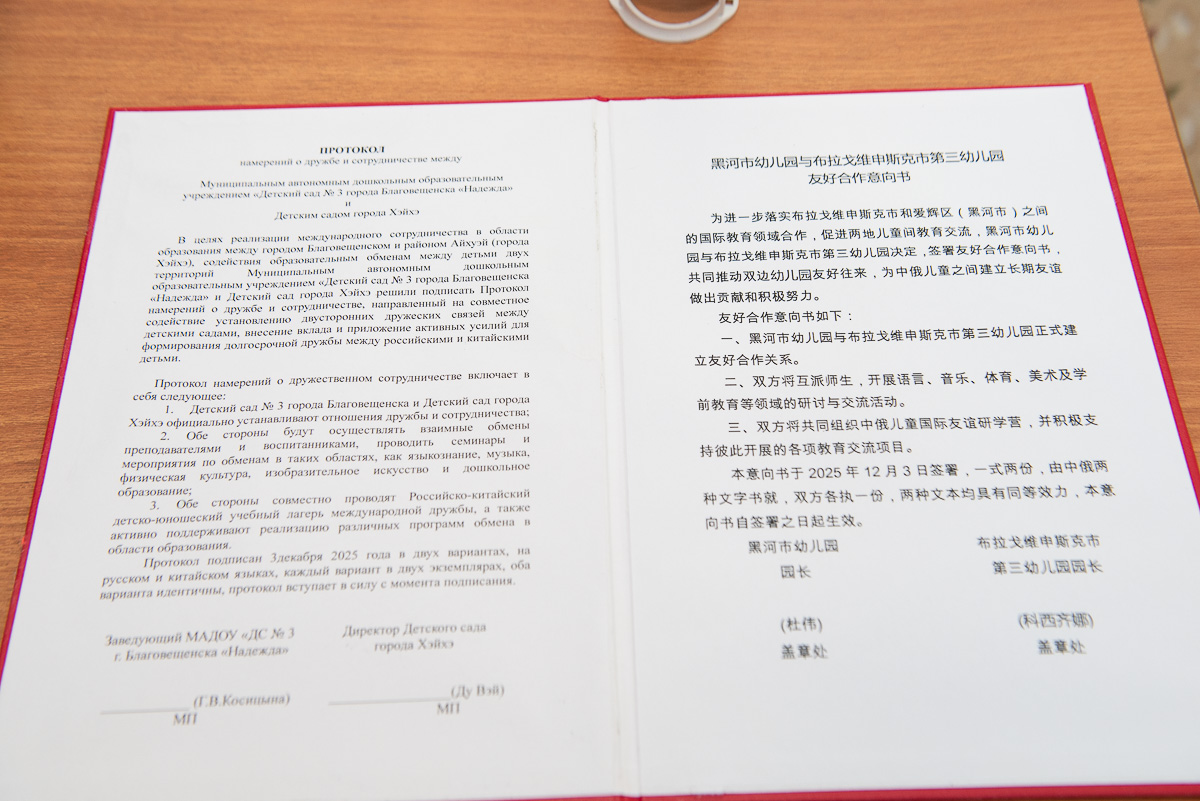 — В 2024 году мы подписали первое соглашение между школами Благовещенска и района Айгунь. Сегодня мы подписали аналогичный документы между детскими садами. Поскольку подходы к дошкольному воспитанию в России и Китае имеют различия, обмен опытом будет ценным опытом для обеих сторон. Стратегические сессии для педагогов запланированы на апрель и сентябрь 2026 года. Кроме того, будущим летом состоится выезд группы дошкольников из Благовещенска в Хэйхэ для участия в спортивных соревнованиях. Это станет первым крупным мероприятием в рамках программы обмена, — прокомментировала событие заместитель начальника управления образования города Благовещенска Елена Костюнина.