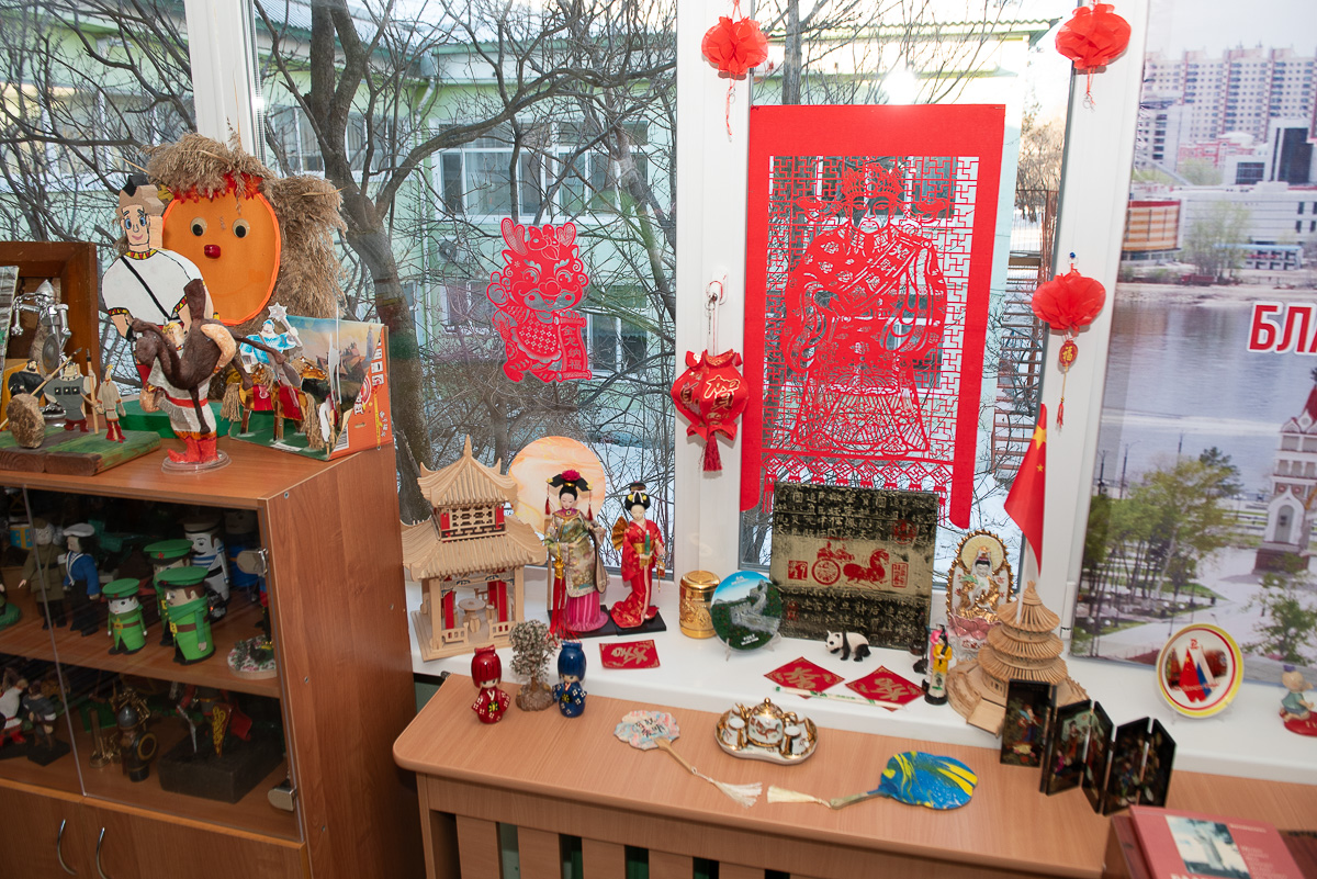 Сюрпризом для педагогов Хэйхэ стала экспозиция, посвященная культуре Китая. На ней представлены веер, красные фонарики и цзяньчжи (традиционное китайское искусство вырезания из бумаги фигур и картин, — Прим. авт. ).