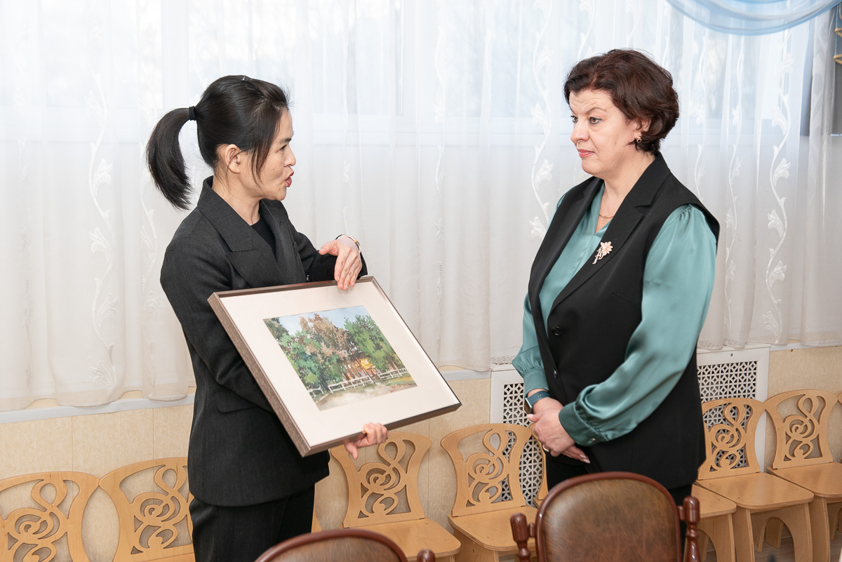 После обмена документами наступил момент душевных подарков. Китайская сторона вручила изящную картину-акварель — работу талантливой воспитательницы из Хэйхэ.