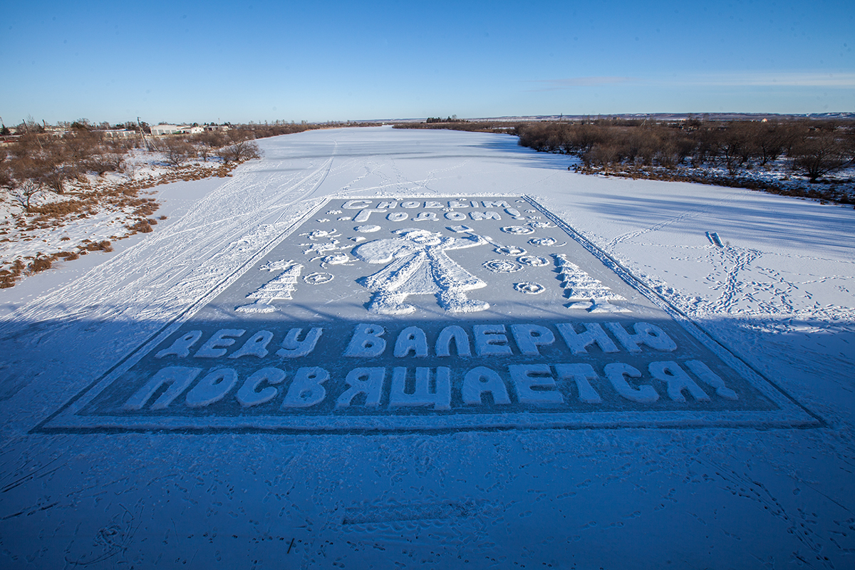 К обеду на озере потеплело до -25, но никто не замерз: художники ловко работали лопатами и метлами и согревались горячим чаем. Спустя несколько часов открытка была готова. Правда, в финале северянам помешал мороз.