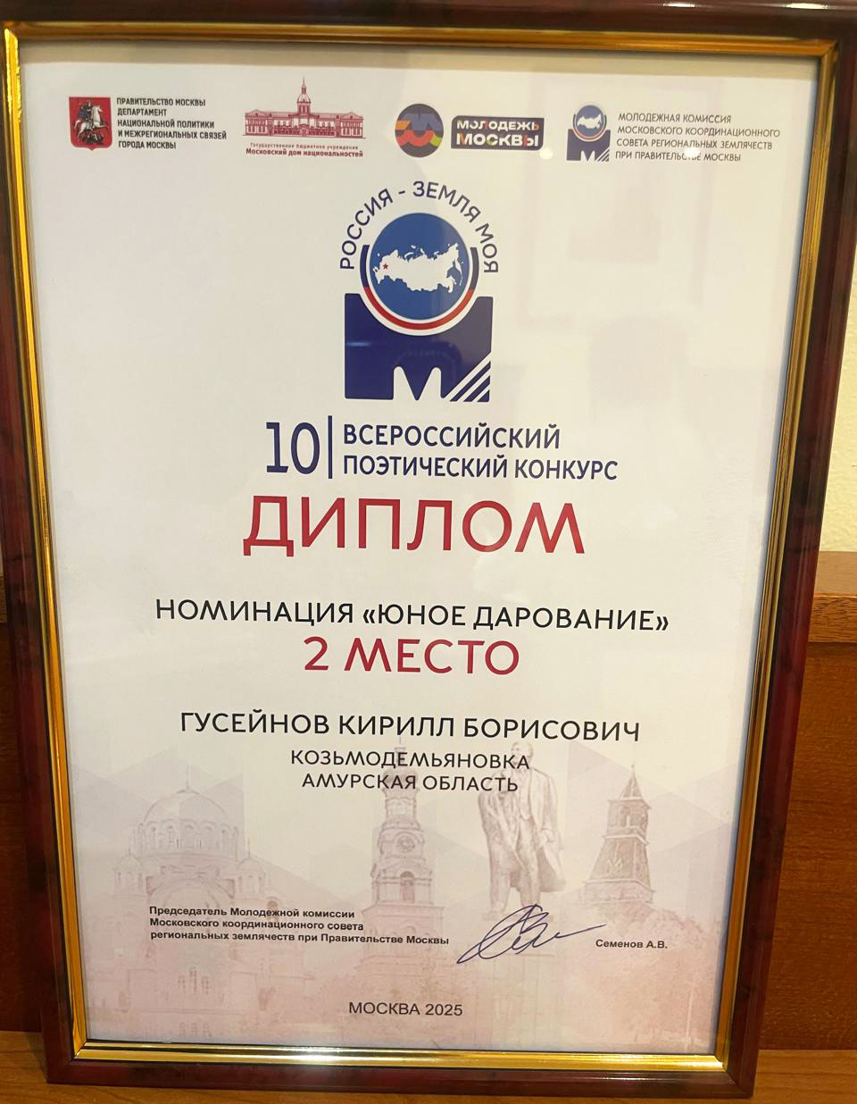 В этом году Кирилл Гусейнов из Козьмодемьяновки участвовал в трех конкурсах: «Памяти героев верны!», «Россия — земля моя!» и «Герой нашего времени». Во всех вошел в число призеров, заняв второе и третье места. А его стихотворения вошли в поэтический сборник, созданный на основе творчества российских юных талантов.